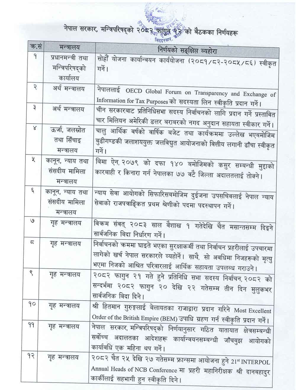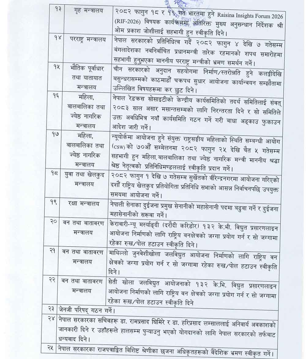 काठमाडौं । फागुन १२ गते बसेको मन्त्रिपरिषद्को बैठकका २५ निर्णयहरु सार्बजनिक गरिएको छ ।